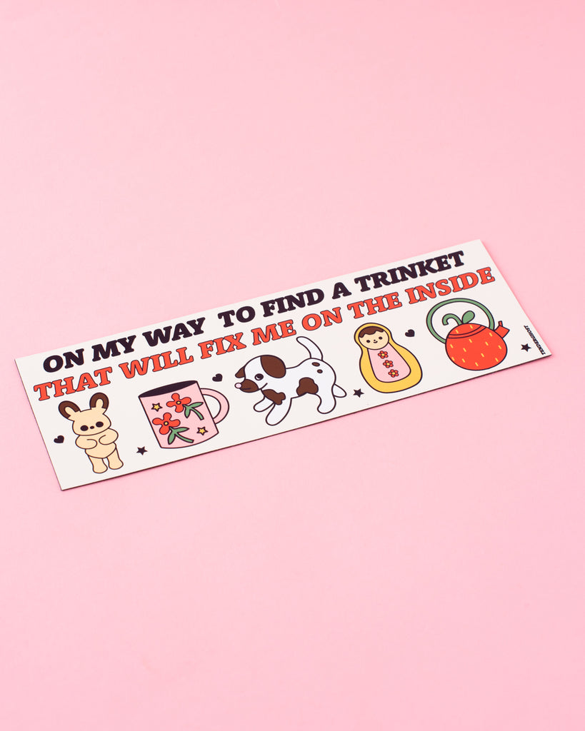 • On my way to find a trinket that will fix me on the inside! This kitschy bumper magnet will leave everyone behind you giggling at how clever you are! The silliest car accessory you need on your bumper. Plus it's a magnet so it won't damage your paint!