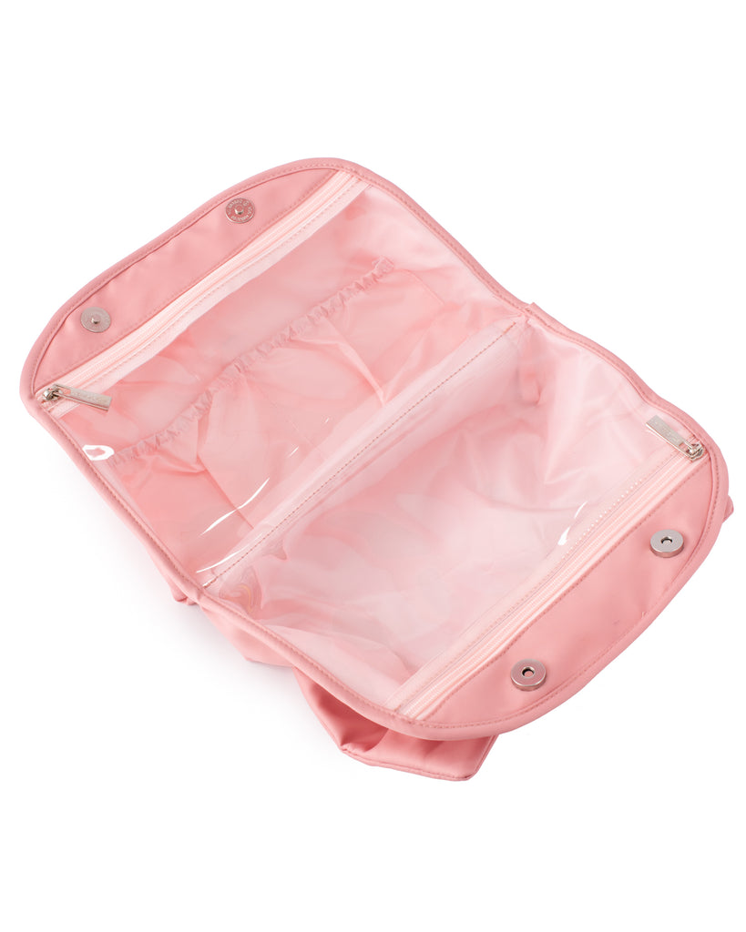 - Easy button top, lay flat design, and big bow feature! This cosmetic pouch has all the features of your new favorite toiletry bag. Use for your makeup, travel essentials, and any other cosmetics. With see-through interior pockets that make it easy to see all of your makeup brushes or other essentials. No more digging through your bag. Plus an easy to clean liner!