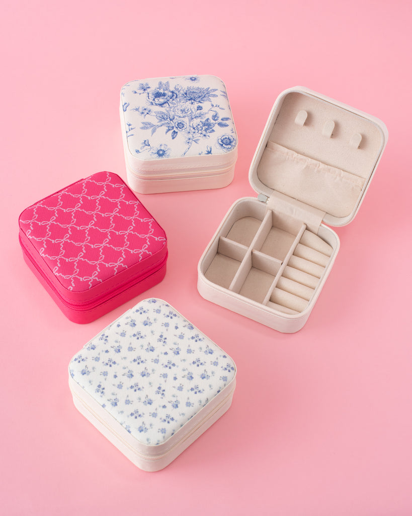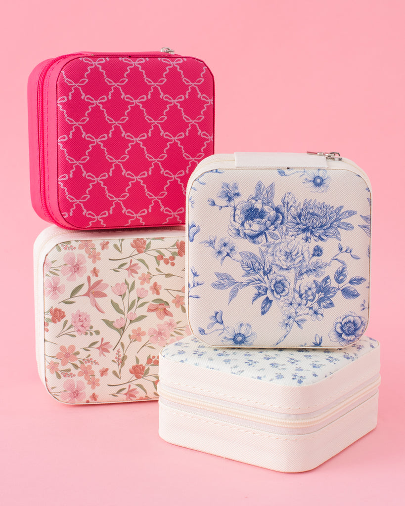 • Need a little organization on-the-go? These jewelry travel cases will make planning your daily accessories a breeze. Each jewelry box features a fun design on the exterior, ring slots, necklace or bracelet hangers, and earring compartments on the interior! The ideal size for throwing in your carry on or luggage.
