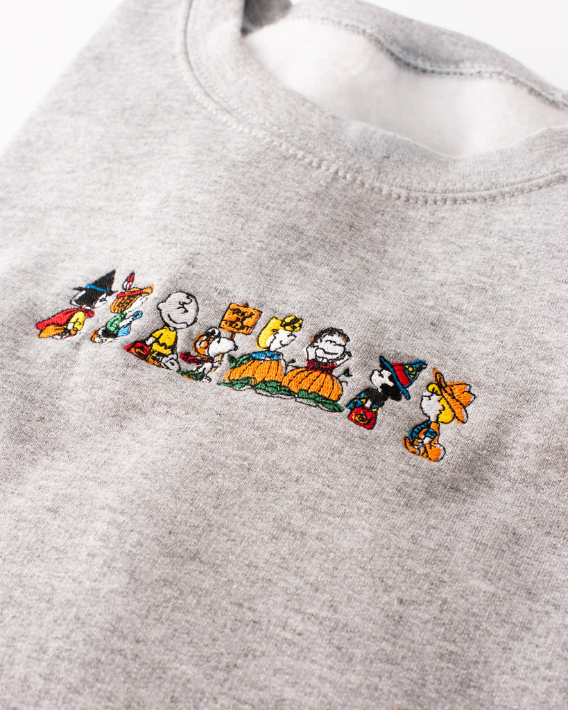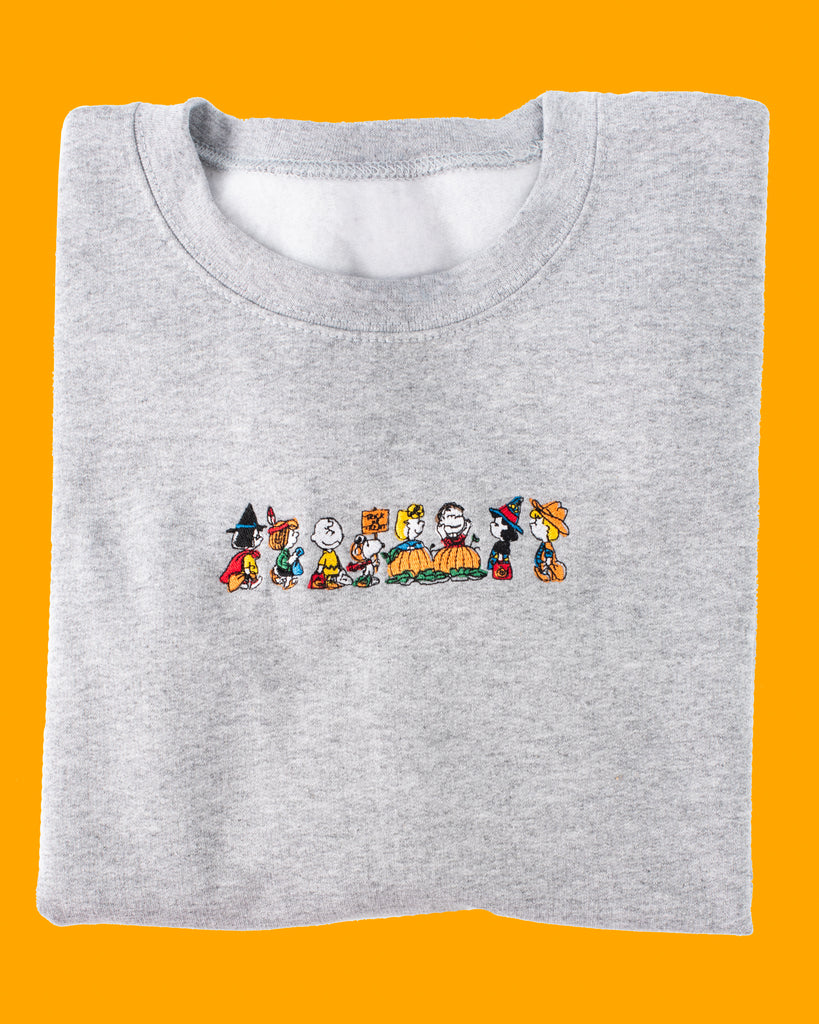- The gangs all here waiting for the great pumpkin! Everyone's favorite beagle and all his friends are ready for trick or treating, corn mazes, and pumpkin picking! This adorable crewneck is embroidered with vibrant colors and is the cutest sweatshirt you'll own! The best nostalgic throwback for any Peanuts fan!