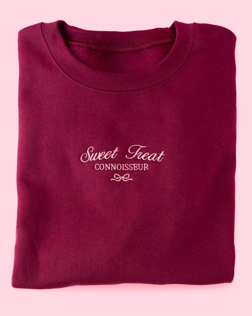 - Everyone deserves a sweet little treat! Especially you! A sweet treat connoisseur, if you will. Look cute and cozy on your way to grab your favorite treat wearing our embroidered Sweet Treat sweatshirt! A warm maroon color and fleece lined. This crewneck will be your new favorite!
