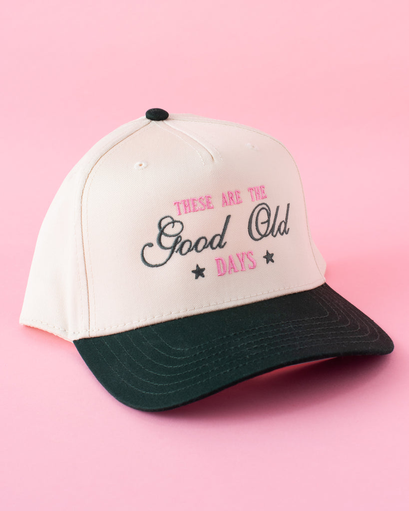 • How do you know you're living in the good ole days? Grab this hat to remind yourself "These ARE the Good Ole Days!" This embroidered two tone trucker hat will add fun and flair to any outfit! Plus this green and pink color combo goes perfect with any wardrobe.