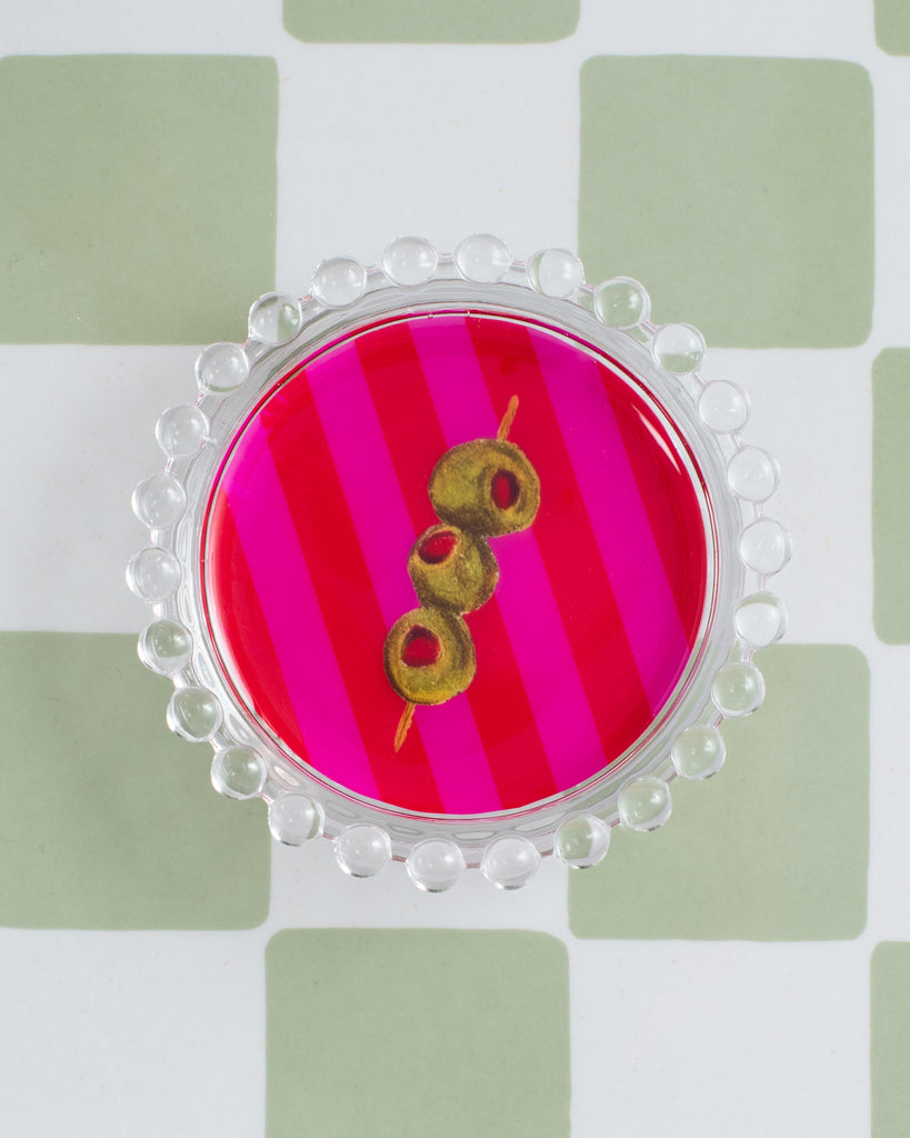 - Who says you can't play with your food? Our new Olives Trinket Dish will let you do just that! This funky little small-batch glass dish features an original, food-inspired illustration on a bold striped background, that is hand-assembled and finished in food-safe epoxy. They're made to bring humor, charm, and a little bit of sweetness into everyday spaces. Such a perfect gift for your martini loving bestie!