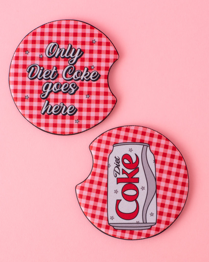 - Diet coke only in this vehicle! The perfect spot for your favorite drink, without all the mess of condensation! These fun, illustrated car coasters will add a little color to your console. Made of neoprene and are washable!