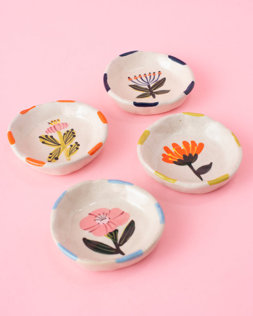 - Quirky ceramic trinket dish perfect for bedside tables, desks, or shelves. Hand-illustrated with playful floral designs that bring personality to any space. Ideal for holding rings, earrings, loose change, keys, or small treasures. The shallow pinch-pot style makes it easy to grab what you need at a glance. A fun, functional accent piece that celebrates bold color and whimsical botanical art.