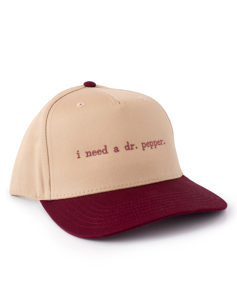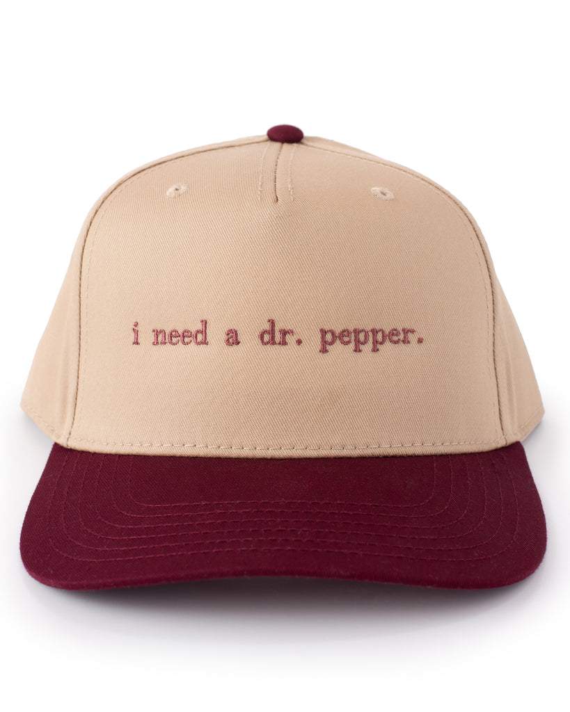 - Calling all Dr. Pepper fans, this hat is for you! The ultimate cool girl cap this summer! Embroidered on a tan and maroon trucker with a snapback closure, this accessory will be your new favorite! The perfect gift for any Dr. Pepper girly! Wear for your lake day, pool day, beach day, or just a bad hair day!