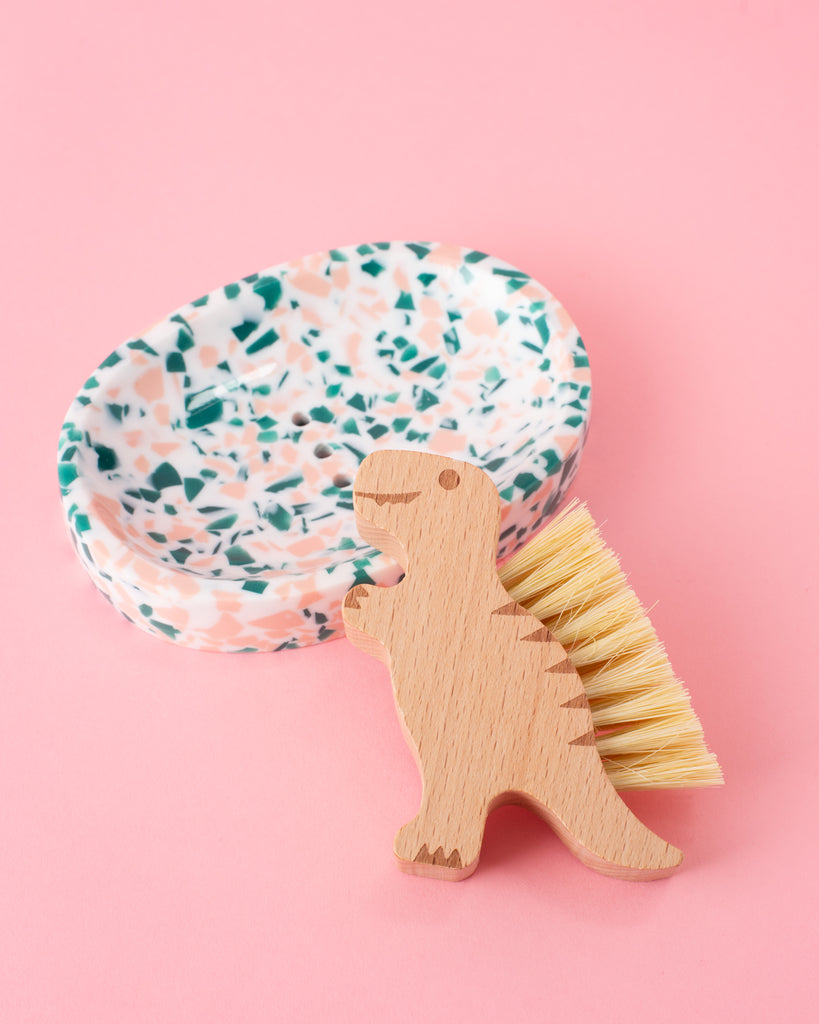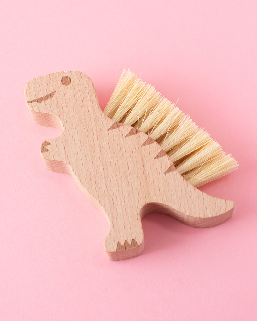 - Add a splash of fun to your kitchen routine with the Wooden Dino Brush! Its playful dinosaur shape and smooth wooden handle make scrubbing veggies or washing dishes a joy. Natural bristles gently clean without scratching, bringing a bit of whimsy and practicality to everyday chores.