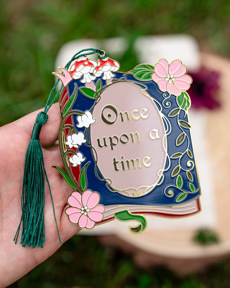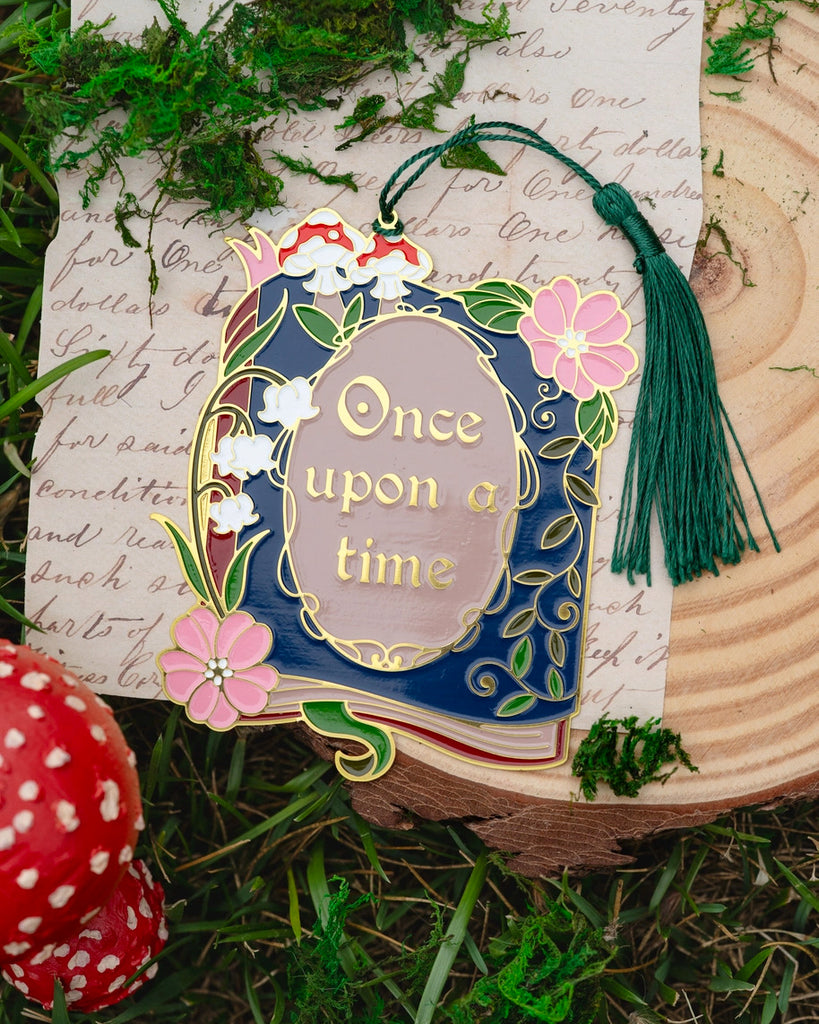 • In your bookish era? Same! This gorgeous Once Upon a Time polished gold metal bookmark showcases a beautiful floral book design with the text "Once Upon a Time" and a forest green tassel! The perfect way to mark your page for anyone who loves a good fairytale!